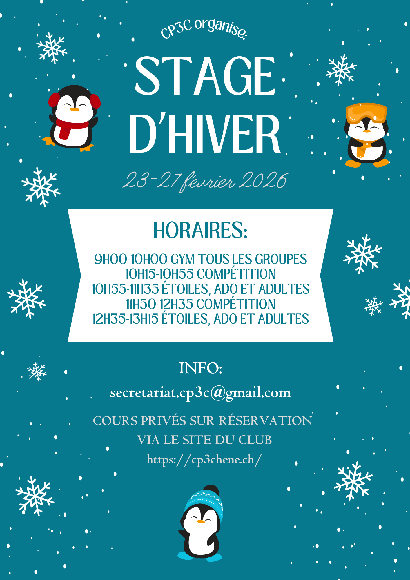 Stage d’hiver + Ajouter à mon Agenda Google + iCal / Outlook export Date Fév 23 - 27 2026 Heure Journée entière Plus d'Infos Lire la suite Lieu Centre Sportif Sous-Moulin Rte de Sous-Moulin 39, 1226 Thônex Site Web http://cssm.ch Téléphone +41 22 305 00 00 Organisateur CP3C Site Web https://cp3chene.ch/ Lire la suite Partagez cet événement Trois communes. Un centre sportif unique. Les horaires de l’administration : Du lundi au vendredi 08h00-12h00 et 14h00-17h00 Mail: info@cssm.ch Téléphone: 022 305 00 00 Adresse: Centre Sportif Sous-Moulin Route de Sous-Moulin, 39 1226 Thônex