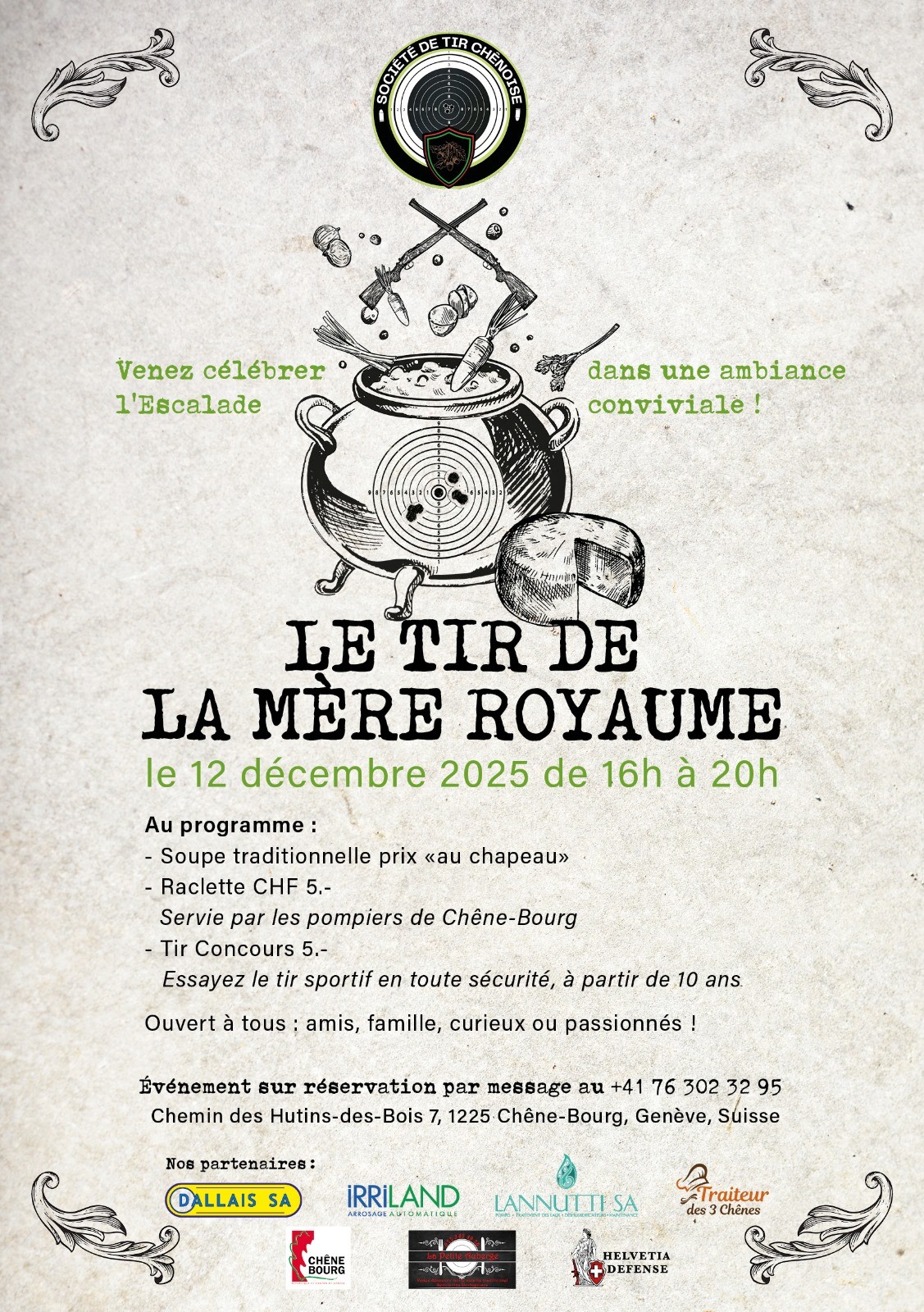 Le tir de la Mère Royaume + Ajouter à mon Agenda Google + iCal / Outlook export Date Déc 12 2025 Heure 16h00 - 20h00 Lieu Société de Tir Chênoise Chemin des Hutins-des-Bois 7 - 1225 Chêne-Bourg Organisateur Société de Tir Chênoise Email infotirchenois@gmail.com Site Web https://tirchenois.ch/ Partagez cet événement Trois communes. Un centre sportif unique. Les horaires de l’administration : Du lundi au vendredi 08h00-12h00 et 14h00-17h00 Mail: info@cssm.ch Téléphone: 022 305 00 00 Adresse: Centre Sportif Sous-Moulin Route de Sous-Moulin, 39 1226 Thônex