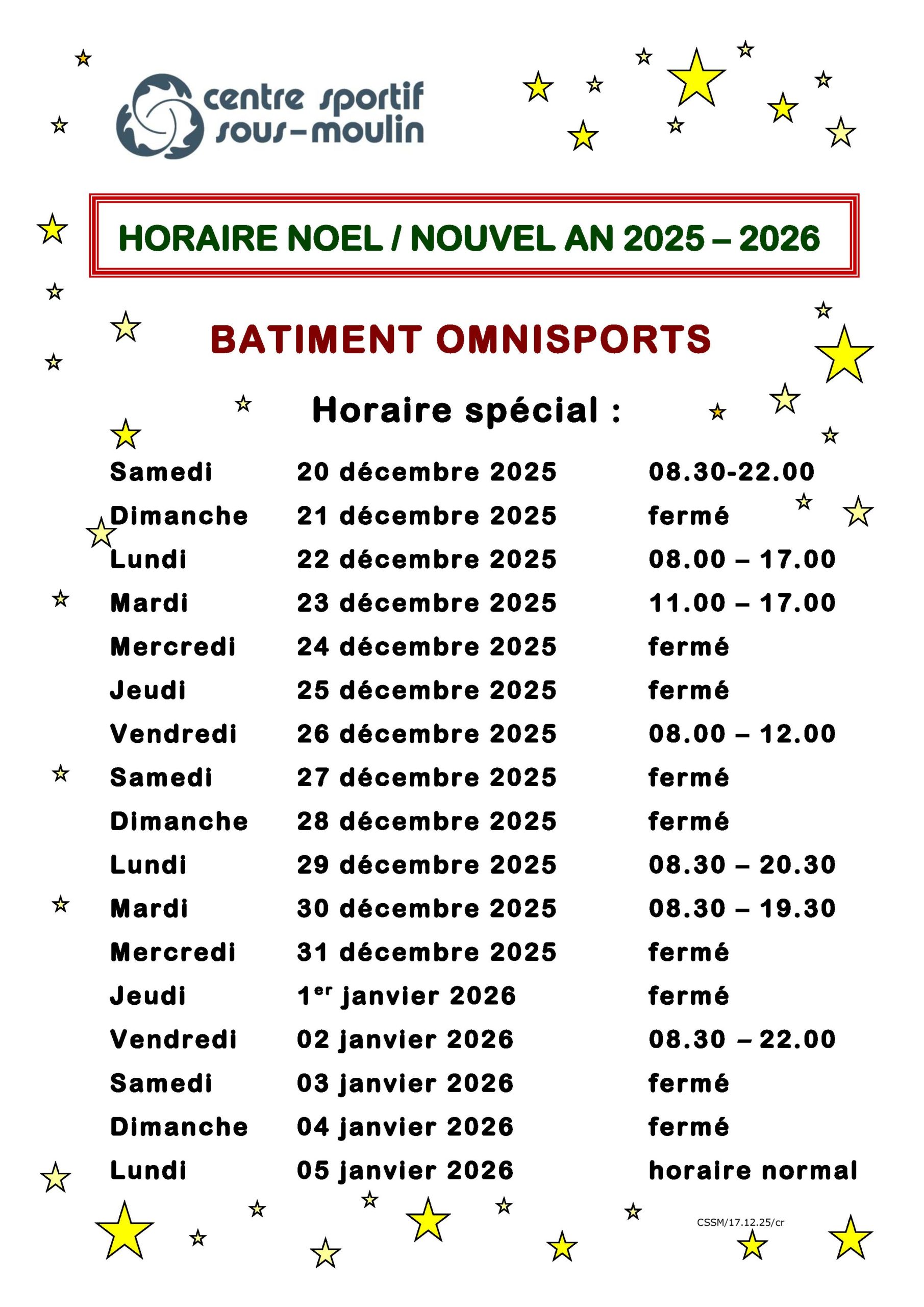 | * Octobre 2025 et mars 2026 | Fermeture à 15h00 les mardis, jeudis et vendredis |