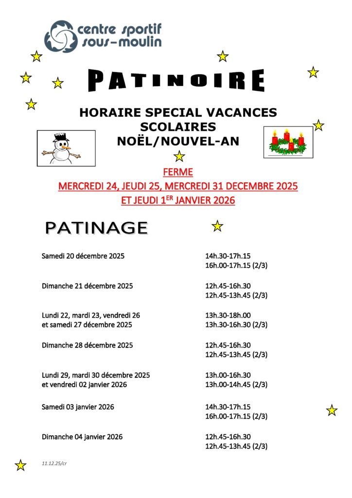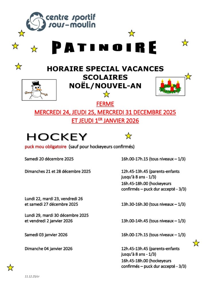 | Samedi | 14h30 – 17h15 | patinage libre (dès 16h00 2/3 de patinoire) |