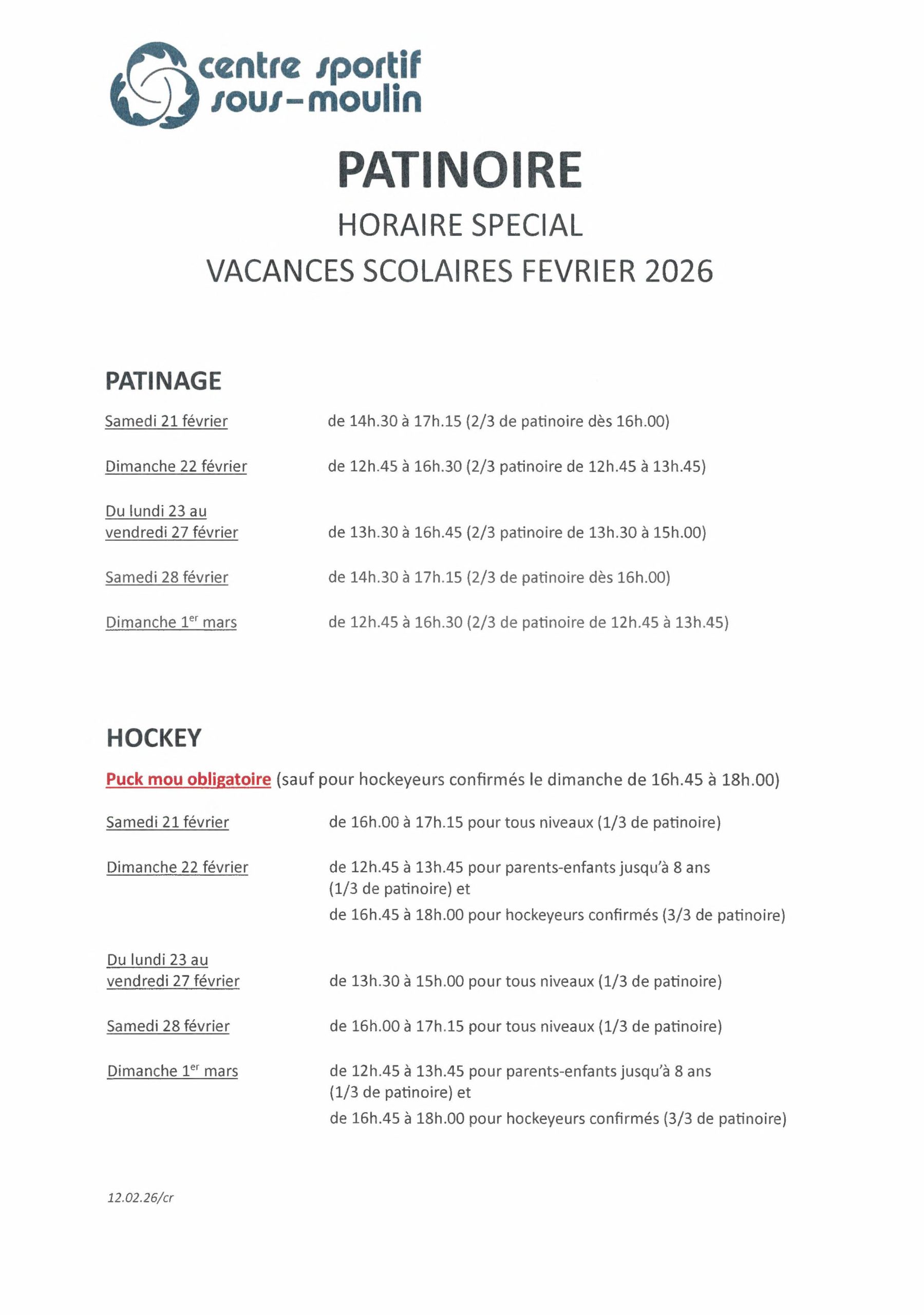 | Dimanche | 12h45 – 16h30 | patinage libre (12h45-13h45 2/3 de patinoire) |