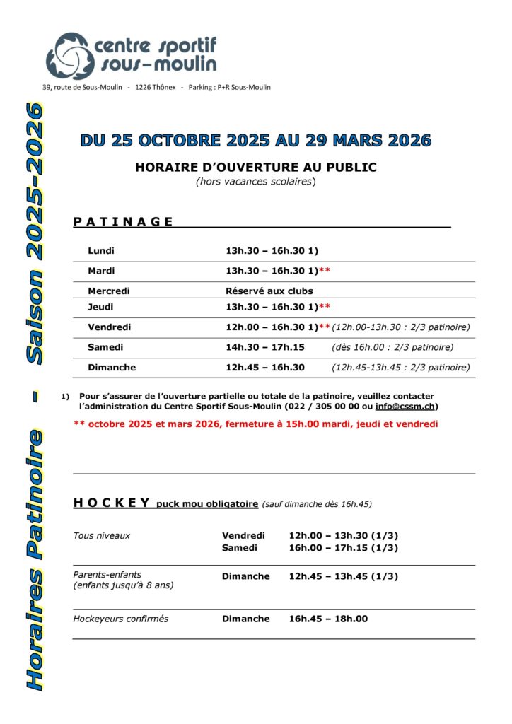 * Réservations : Auprès de la caisse de la patinoire pendant les heures publiques au 022/305 00 60